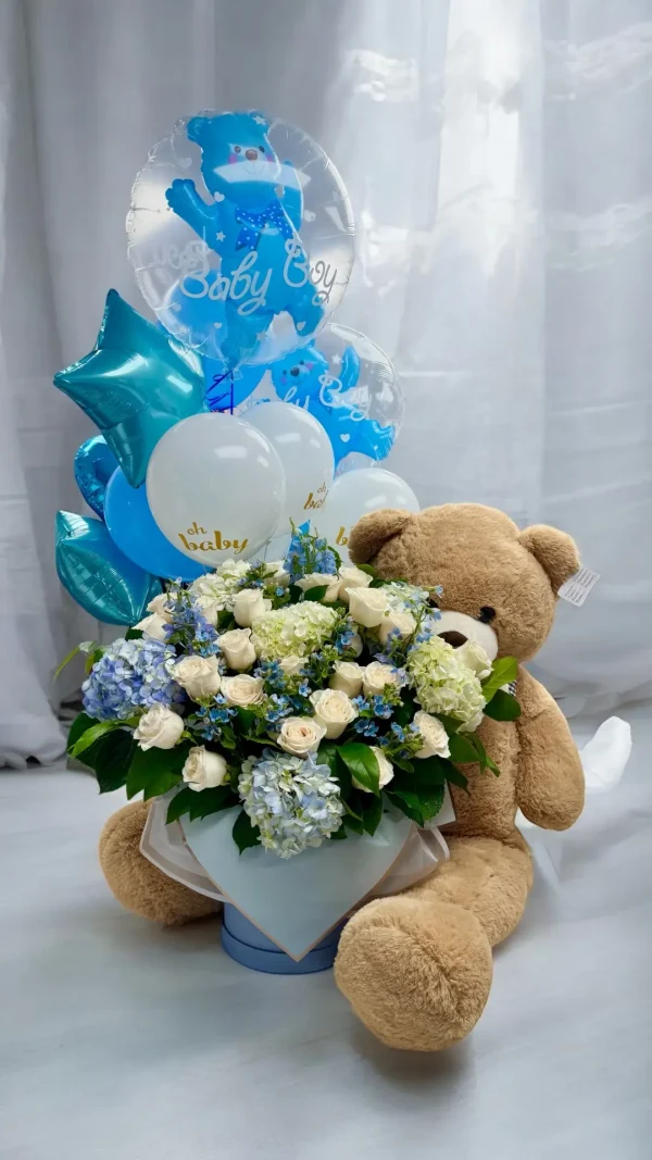 Welcome the new arrival with a thoughtful baby boy gift featuring fresh flowers, themed balloons, and a soft teddy bear.
