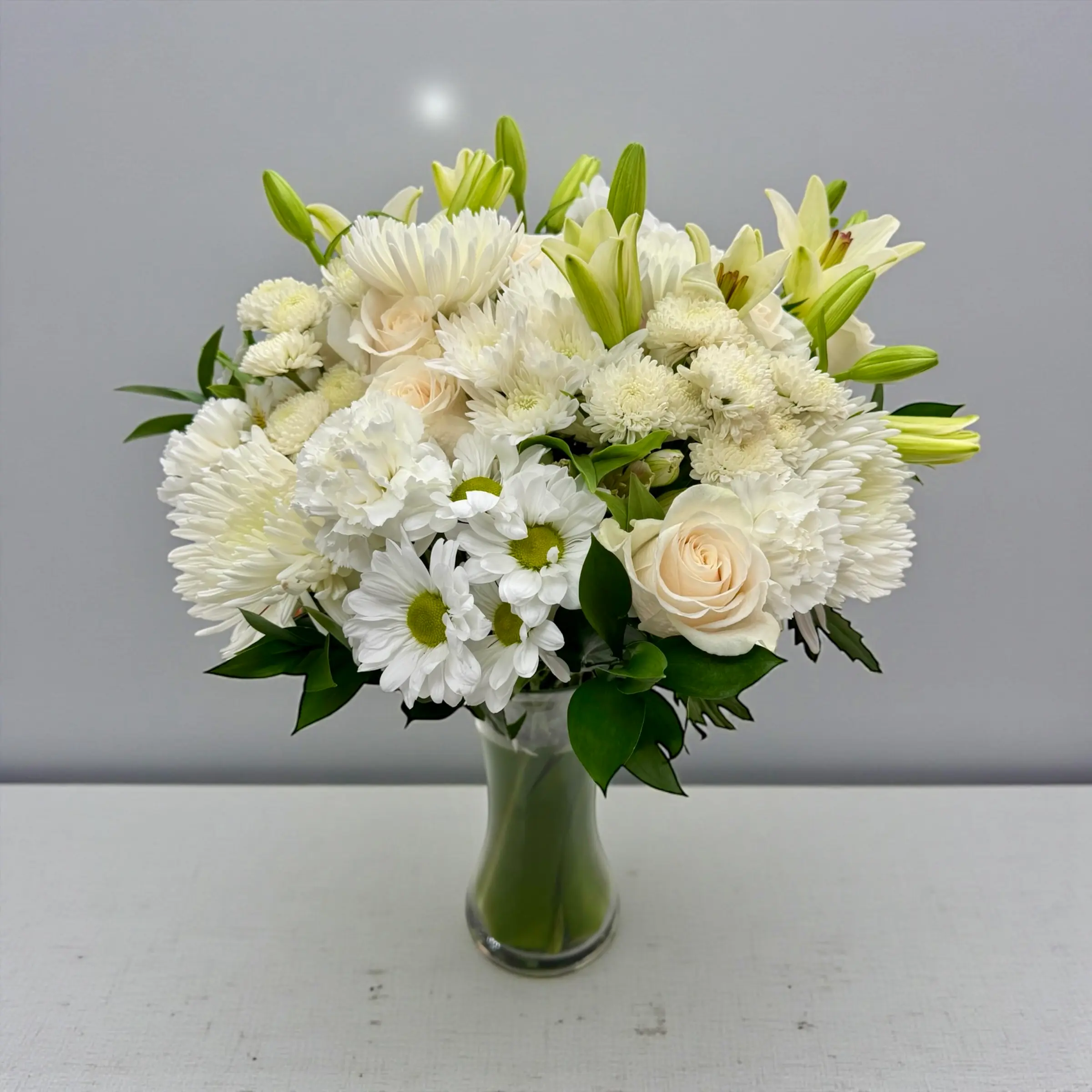 A soft, elegant blend of white blooms arranged in a clean vase. This white flower mix design brings a calm and timeless look suitable for gifting or decorating any room.