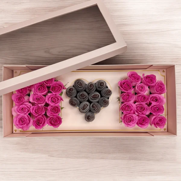 The pink roses can stay fresh for about 3–5 days with proper care. The chocolate strawberries are best enjoyed within 1–2 days.